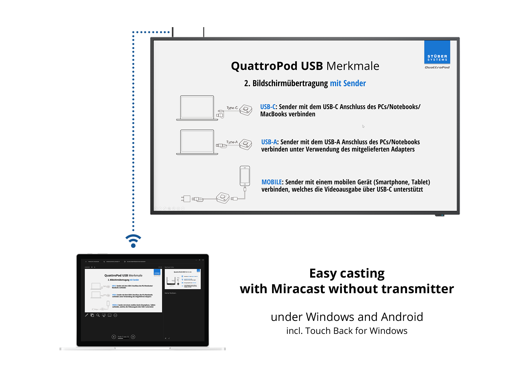 Windows and Android devices can also share your screen content using Miracast. Under Windows, you can also use the touch-back function of Miracast. QuattroPod Mini supports Miracast natively. So in this case you do not require the transmitter.