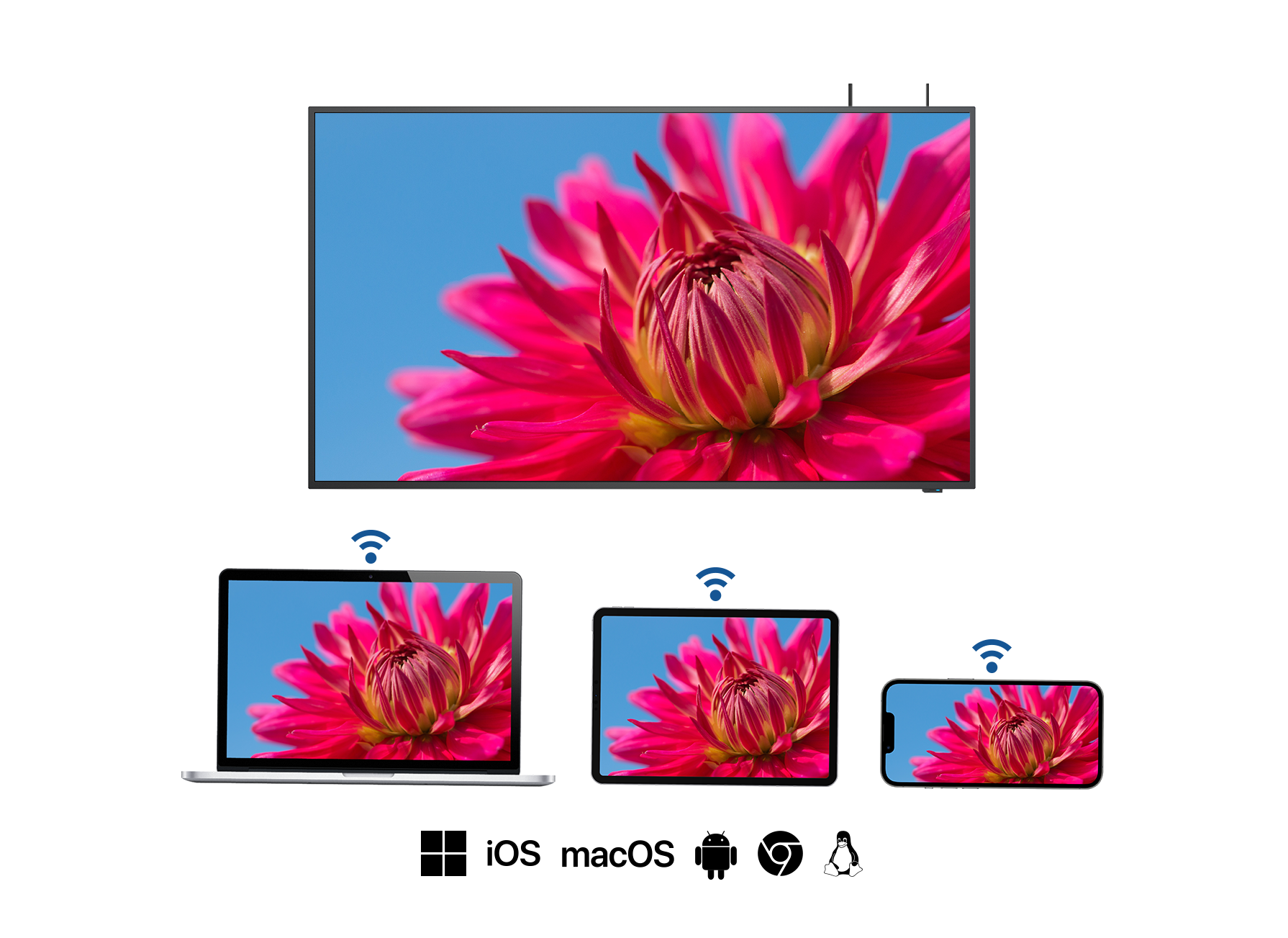 Verwenden Sie die eingebaute Bildschirmübertragungsfunktionalität Ihres Gerätes. Unterstützt werden alle gängigen Bildschirmtechnologien inkl. Miracast für Windows/Android, Apple AirPlay für iOS/macOS und Google Cast über den Chromebrowser.